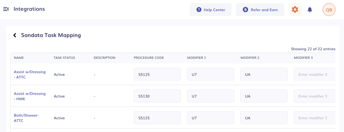 2. Navigate to Integrations > Sandata > Configuration and map your Timeero tasks with the corresponding procedure information.