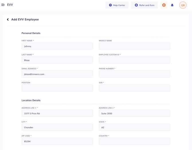 2. Fill in all the required information and then click on Add EVV Employee. This should create an employee in the Sandata aggregator. Note: This change may not reflect instantly on the aggregator.